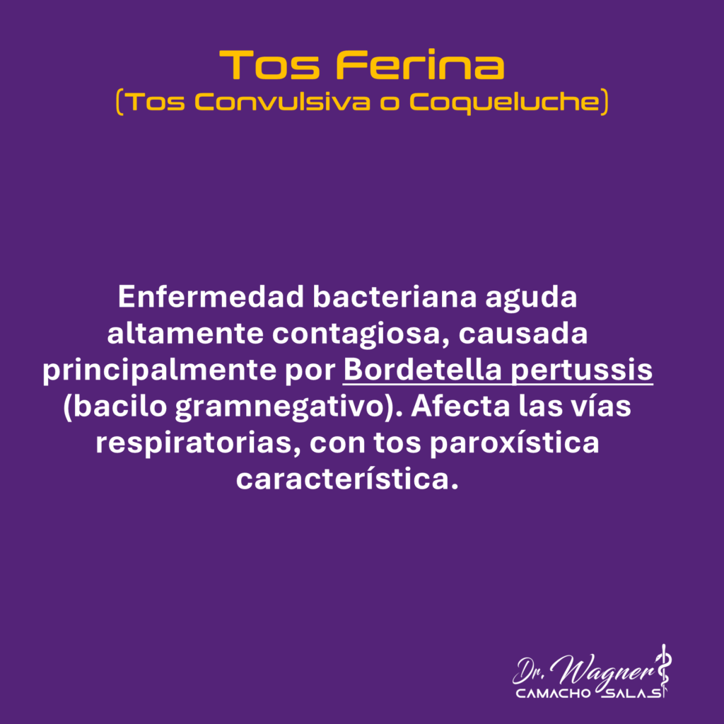La tos ferina, también conocida como pertussis o tos convulsa, es una enfermedad infecciosa altamente contagiosa causada por la bacteria Bordetella pertussis. Se caracteriza por ataques violentos de tos que pueden dificultar la respiración, especialmente en bebés y niños pequeños